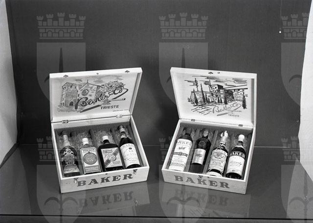 Cassette natalizie di liquori della Baker s.p.a. di Trieste.La ditta Baker venne fondata a Londra nel 1898 da Arthur Arnold Baker e suo cugino George, specializzandosi nell'importazione, imbottigliamento e vendita di rum. Il 7 ottobre 1907 apre la filiale di Trieste, con stabilimento nel rione di Barcola dove venivano miscelati diversi tipi di rum centro-americano di altissima qualita', autentici distillati di canna di zucchero demerara, che venivano venduti in bottiglie con etichette dalla grafica poco comune. Il rum di Baker - l'Australian Rum e il Battle Axe Jamaica Rum - era particolarmente popolare tra i marinai delle navi inglesi che facevano scalo a Trieste, maggior porto dell'impero austro-ungarico. Ed altrettanto richiesto e diffuso nelle piu' qualificate pasticcerie di Vienna, Praga e Budapest per la confezione di dolci. Rifugiatosi in patria durante la 1. guerra mondiale, A.A.Baker rientra a Trieste nel 1918 riaprendo la stabilimento.Dopo numerosi passaggi di proprieta', la ditta fu trasferita nel 1983 a Gorizia per il particolare regime fiscale di alcuni componenti base (alcool, zucchero).