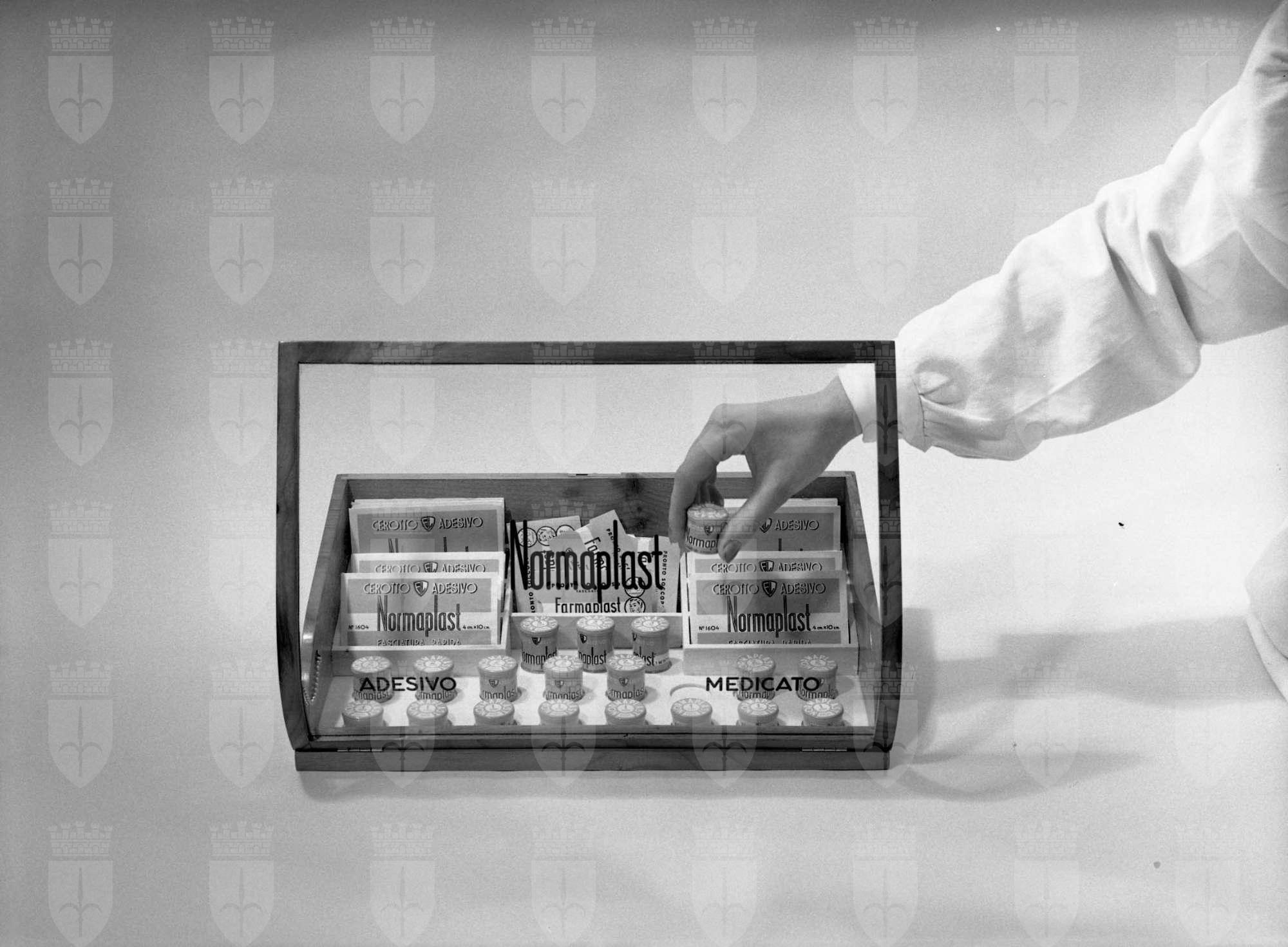 Riproduzione di un espositore con cerotti adesivi medicati Normaplast
