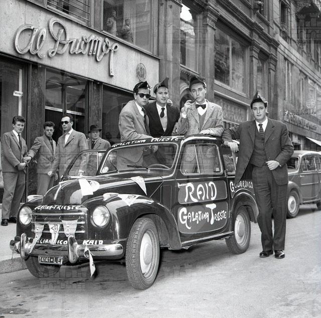 A bordo di una Giardinetta, quattro goliardi dell'Ateneo barese (Sandro e Piero De Riccardis, Giacomo Viva ed Enzo Caglio) hanno compiuto il raid Galatina, Napoli, Roma, Siena, Firenze, Bologna, Padova, Trieste. Tratto da Il Piccolo, 12-13 aprile 1955