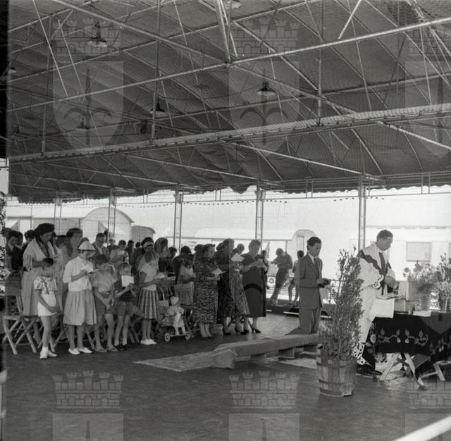 Viene celebrata una Messa sotto il tendone di un luna-park.