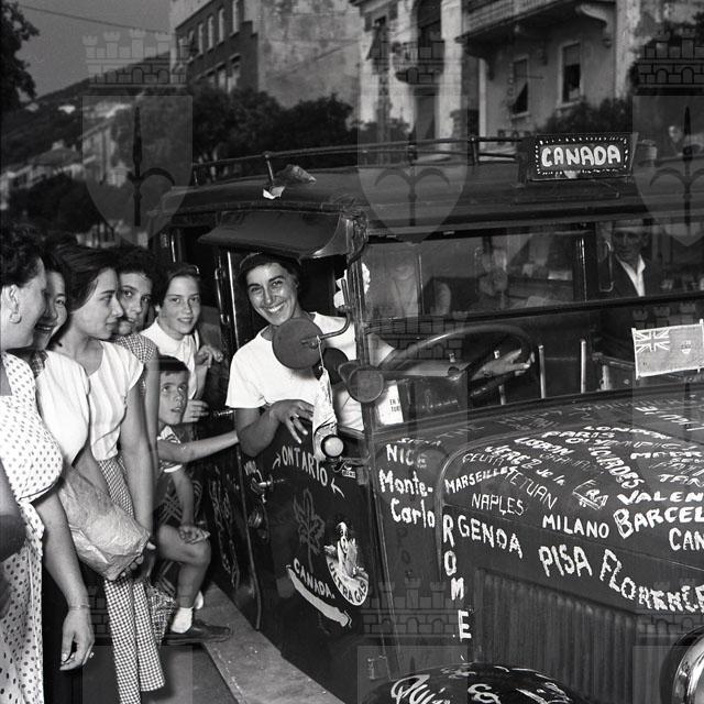 Alcune ragazze canadesi giungono a Barcola a bordo di una vecchia automobile. Sulla carrozzeria compaiono numerose scritte a testimonianza delle tappe toccate dal loro tour.