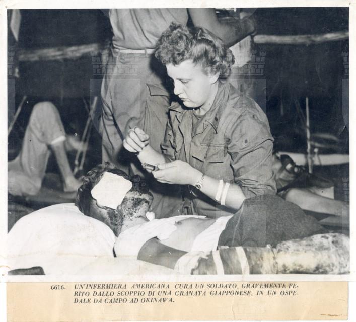 Un'infermiera cura un soldato americano ferito al volto dallo scoppio di una granata giapponese sull'isola di Okinawa