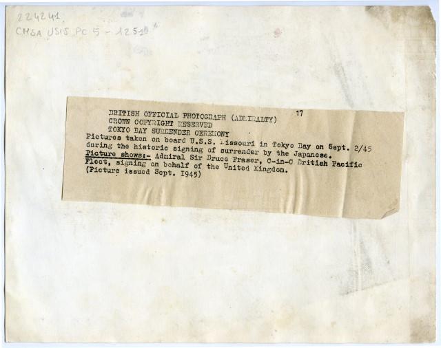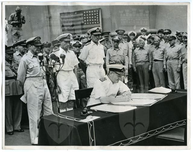 L' ammiraglio Bruce Fraser, firma la resa giapponese il 2 settembre 1945 a bordo della nave Missouri attraccata nella baia di Tokyo.
