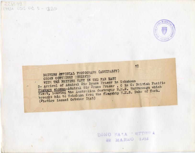 L'Ammiraglio inglese Sir Bruce Fraser approda sulle coste di Yokohama.
