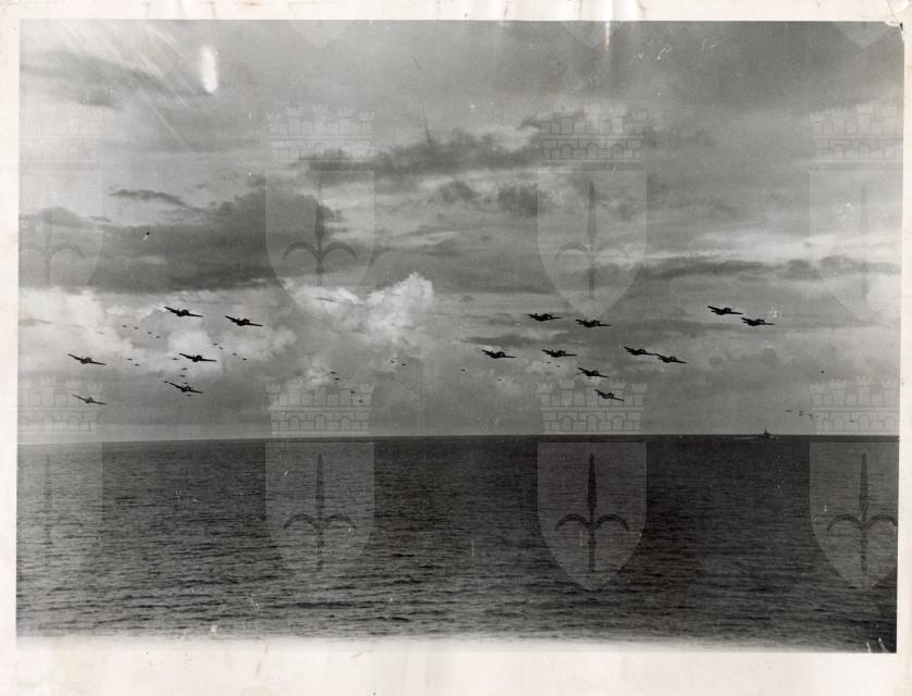 Aerei inglesi in volo pronti ad attacare alcune raffinerie giapponesi sull'isola di Sumatra.