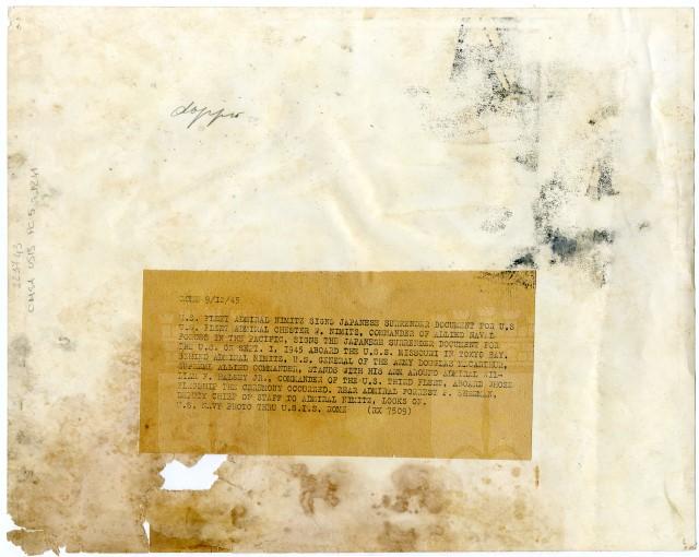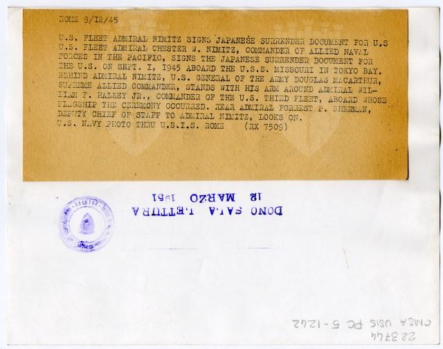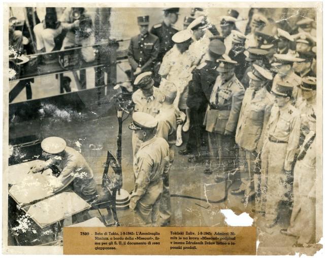 Sulla nave «Missouri», attraccata nella baia di Tokyo, il 01/09/1945, il comandante della Marina americana Chester W. Nimitz firma il documento della resa del Giappone.