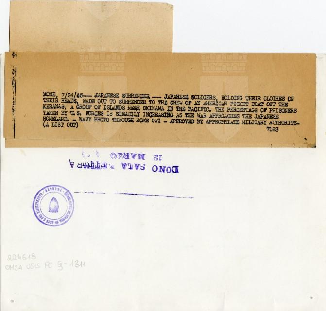 Alcuni militari giapponesi si arrendono agli americani: vengono raccolti dalle navi nelle acque di Okinawa.