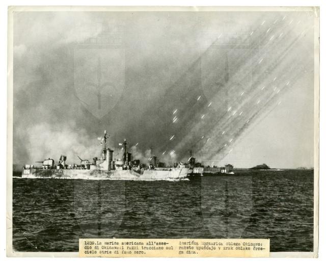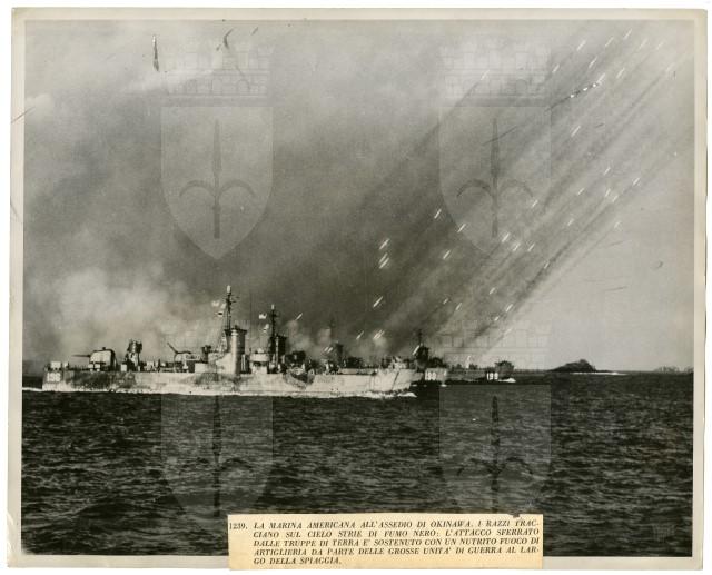 Lancio di razzi americani contro navi giapponesi durante la battaglia di Okinawa.