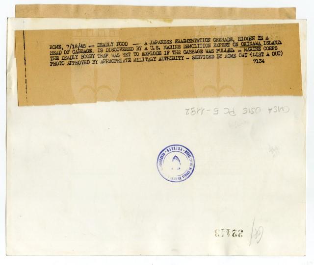 Un marinaio americano di istanza sull'isola di Okinawa mostra una granata giapponese nascosta all'interno di una pianta di cavolo.