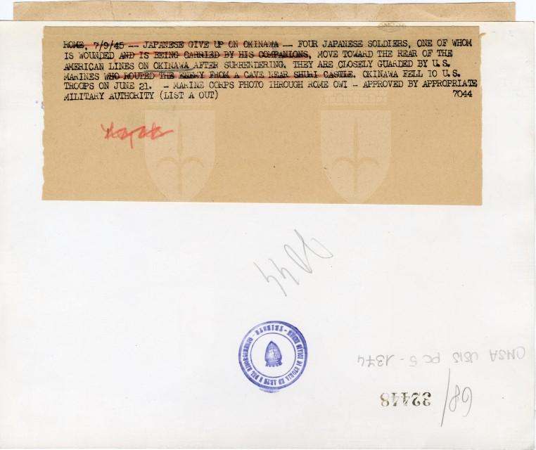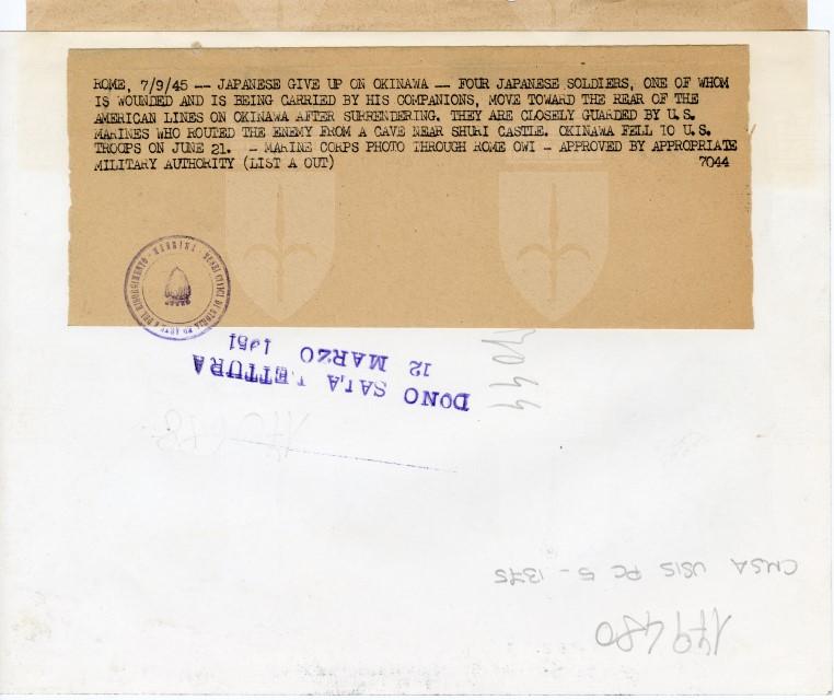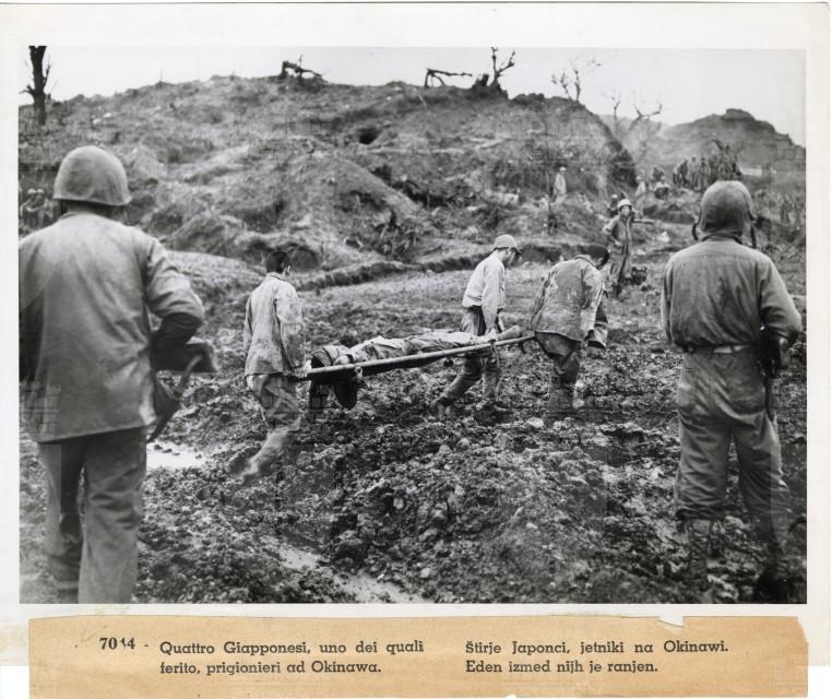 Soldati giapponesi, fatti prigionieri ad Okinawa, trasportano un loro commilitone ferito.