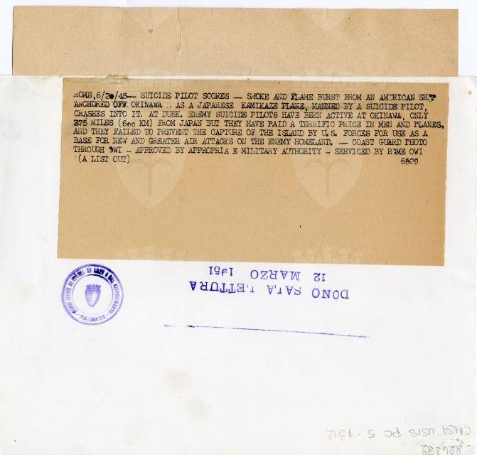 Una nave americana in fiamme dopo un attacco suicida da parte di un aereo giapponese nelle acque di Okinawa.