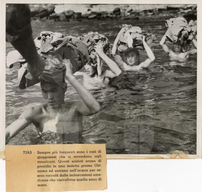 Alcuni militari giapponesi si arrendono agli americani: vengono raccolti dalle navi nelle acque di Okinawa.
