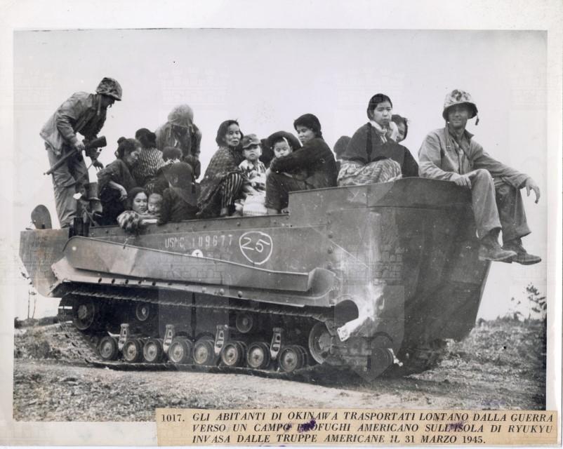 Marinai americani trasportano alcune donne e bambini di Okinawa verso un campo profughi americano lontano dalla guerra.