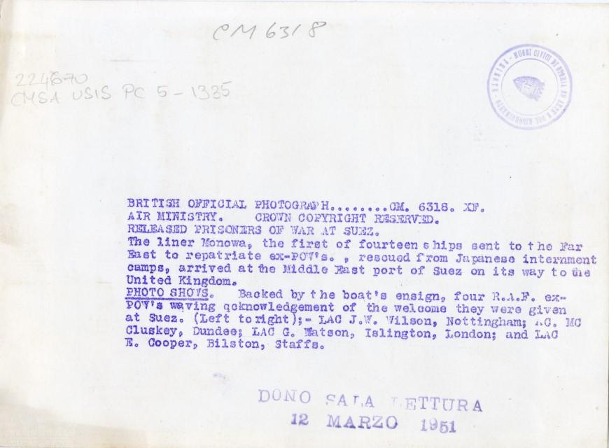 Quattro soldati inglesi, fatti prigionieri in Giappone, si trovano su una nave nel Porto di Suez che li riporterà in Gran Bretagna.
