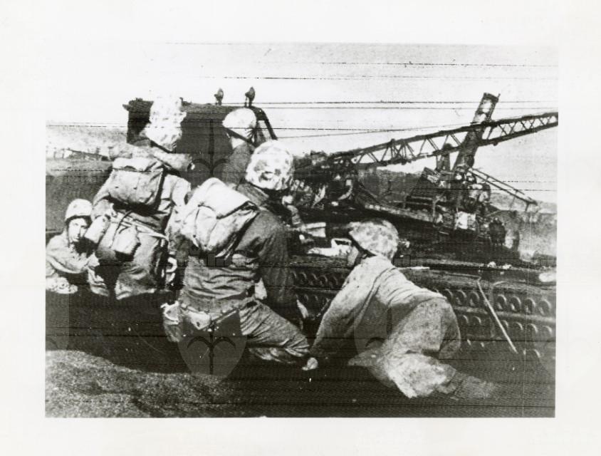 Marinai americani accovacciati dietro un mezzo da assalto durante la battaglia di Iwo Jima.