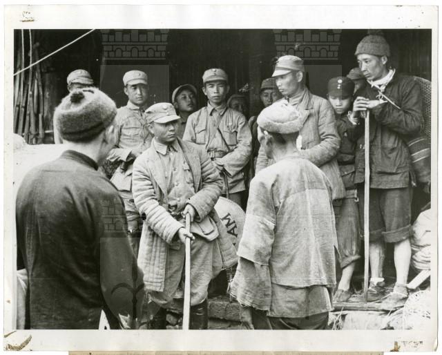 Questioning Chinese accused of collaborating with Japanese. A Chinese civilian suspected of giving aid and information to the Japs is questioned by a Chinese army colonel at divisin headquarters in the Salwee river area (...)