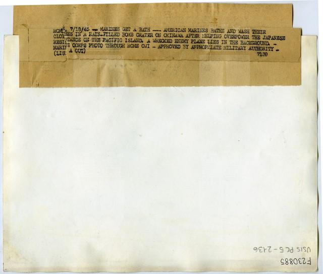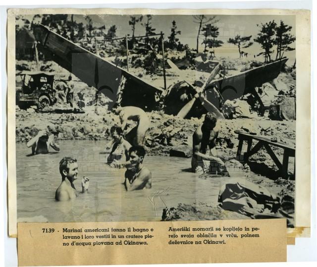 Marinai americani fanno il bagno nel cratere di una bomba pieno d'acqua piovana sull'isola di Okinawa.