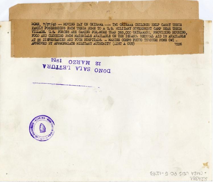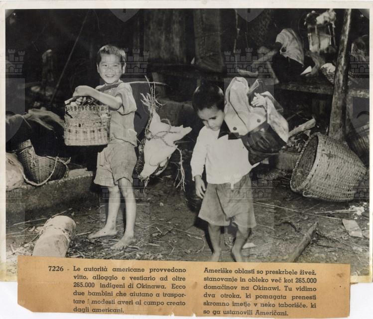 Due bambini di Okinawa aiutano a trasportare gli averi di famiglia dal loro villaggio ai campi americani.