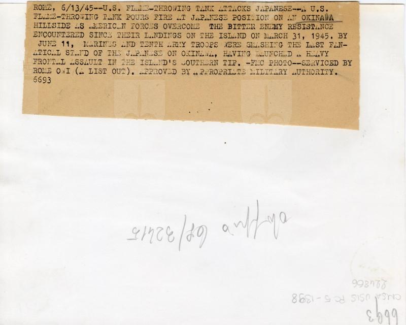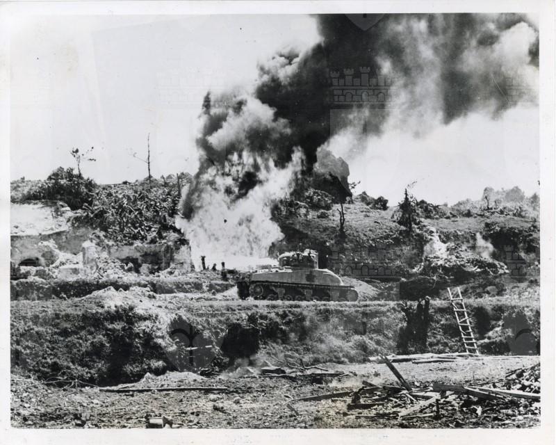 Un carro armato lanciafiamme americano attacca una posizione giapponese sull'isola di Okinawa.