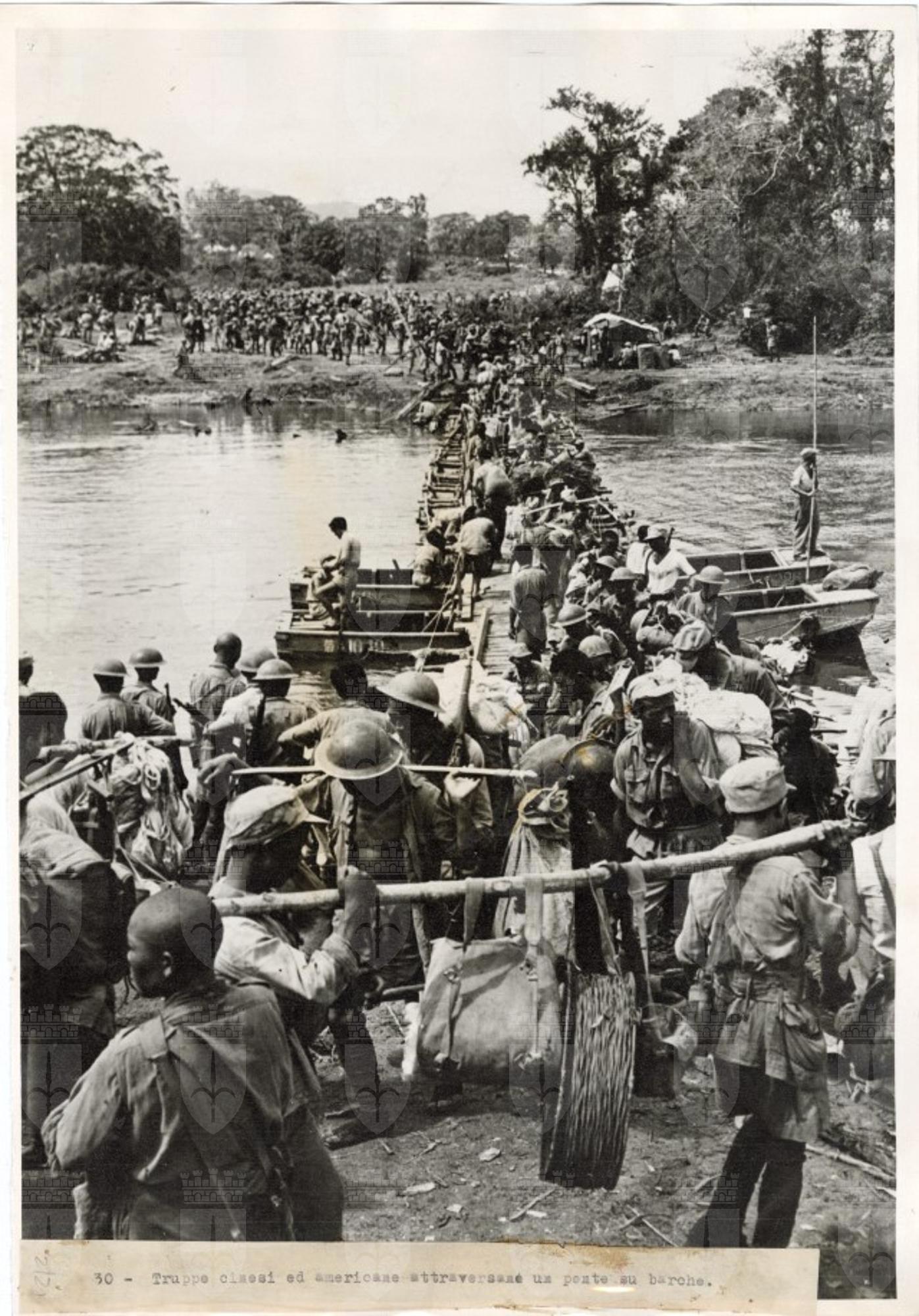 Truppe cinesi ed americane attraversano un ponte su barche
