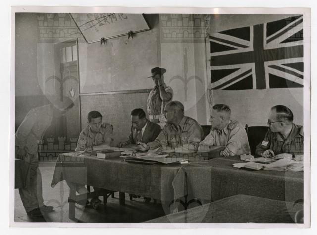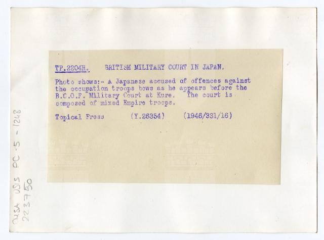 Un giapponese, accusato di attacchi contro le truppe alleate, si presenta davanti alla Corte militare inglese nella città di Kure.
