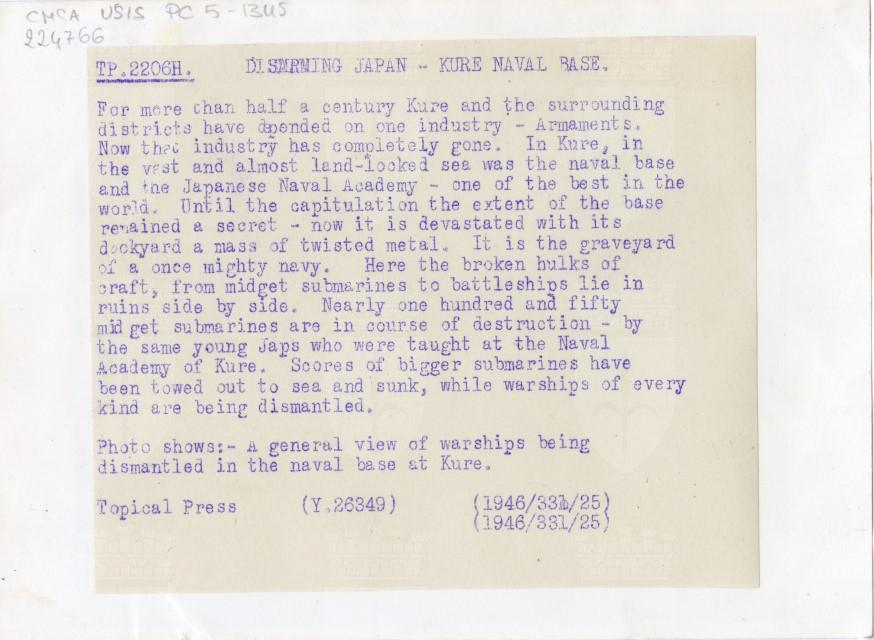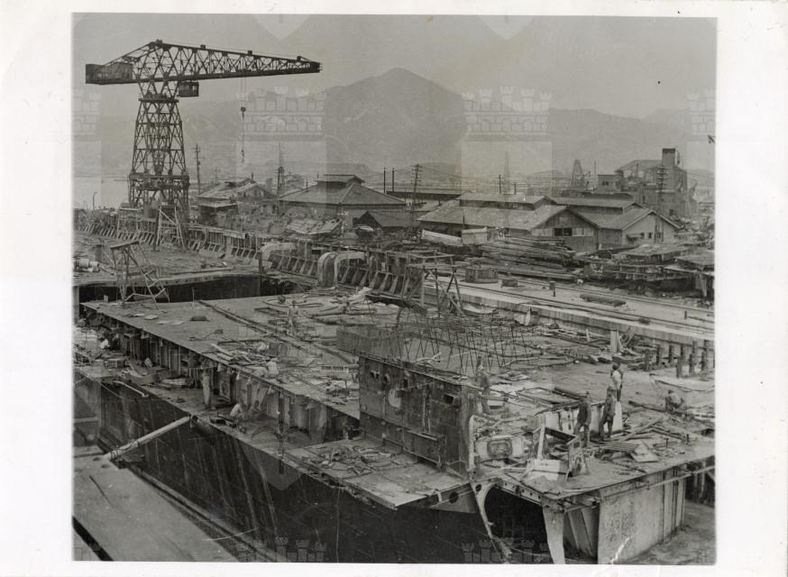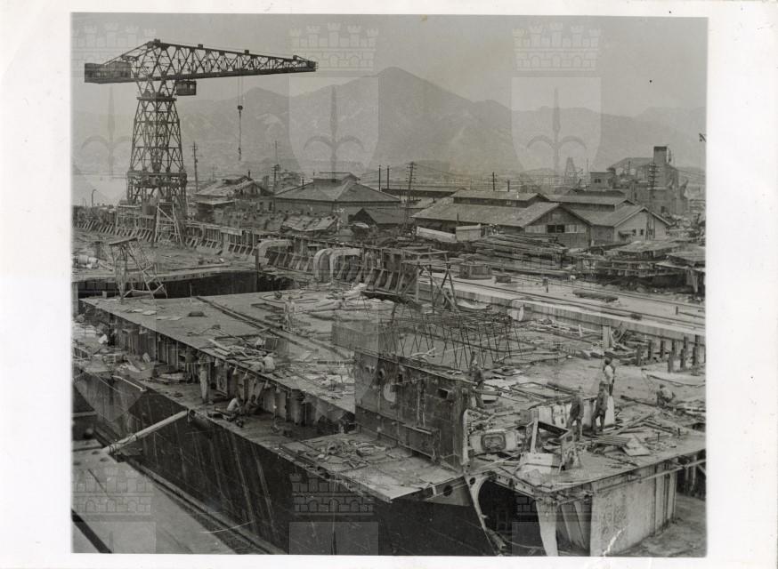 Veduta d'insieme della base navale di Kure, una delle più importanti e grandi del Giappone e sede dell'Accademia navale. La foto mostra il disfacimento in cui è caduta dopo la resa del Giappone.