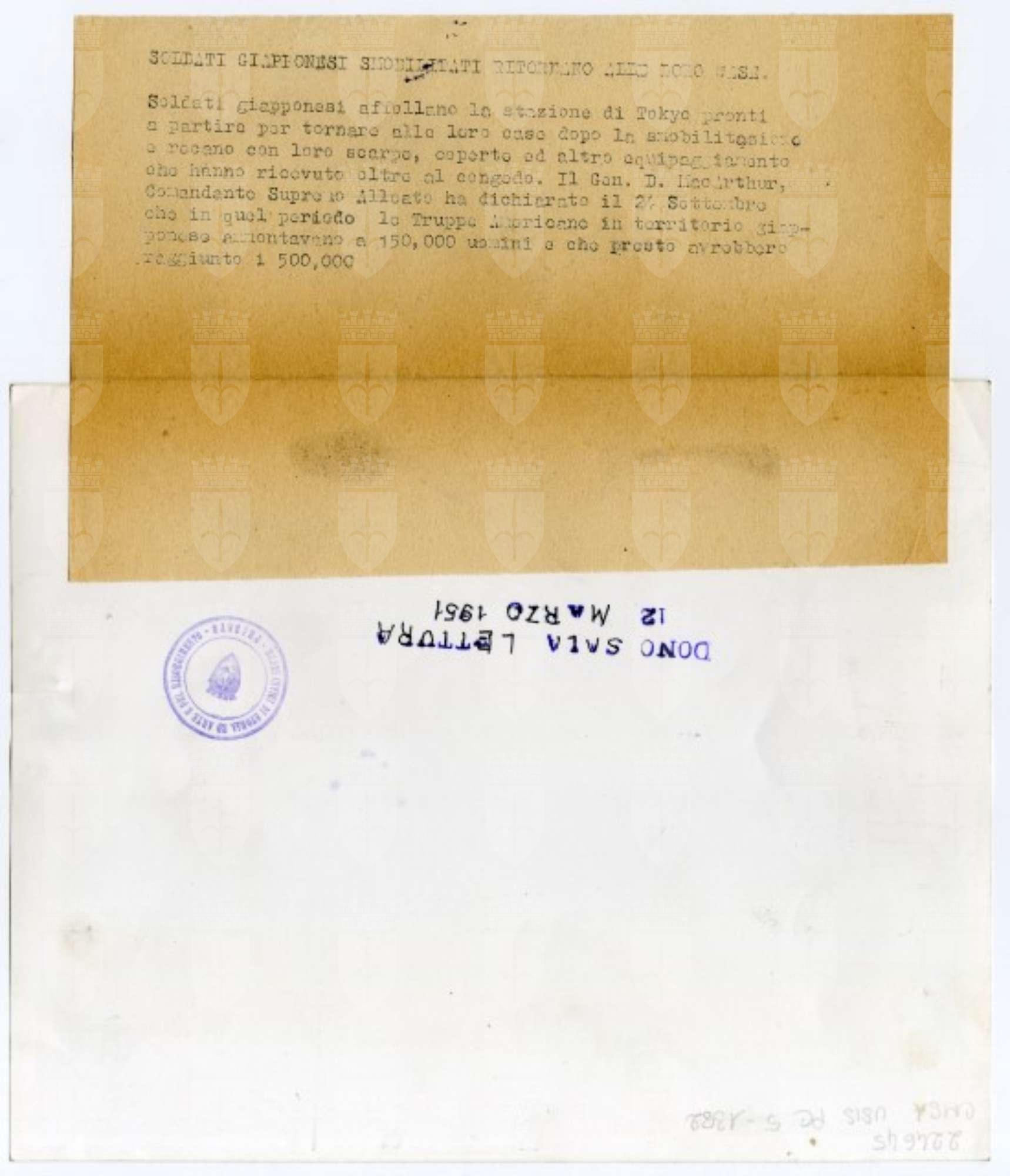 Alcuni soldati giapponesisi trovano alla stazione ferroviaria di Tokyo e sono pronti a tornare a casa, dopo la firma della resa del Giappone del 2 settembre 1945.