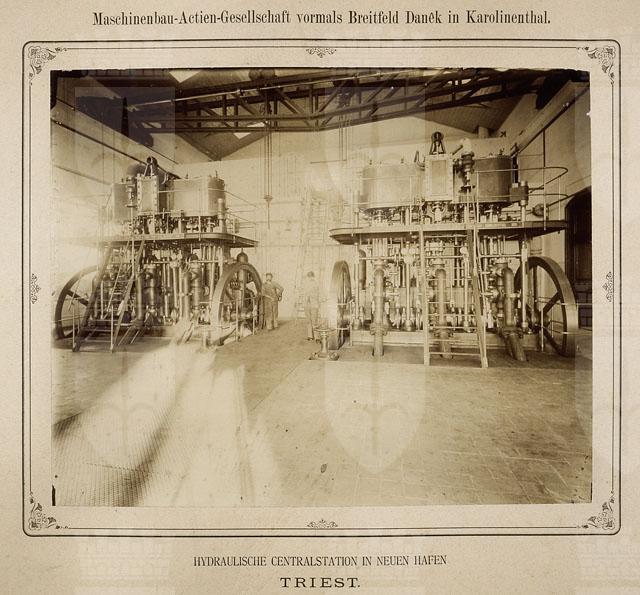 Nel 1891 la Centrale Idrodinamica entra in funzione e fornisce l’energia per il funzionamento di arredi meccanici, gru e montacarichi azionati da acqua sotto pressione1. La fotografia entra nel porto, immortalando l’edificio non solo all’esterno ma anche all’interno, mettendo in risalto la meravigliosa volumetria futurista e la modularità geometrica dei macchinari industriali. I positivi di grandi dimensioni sono elegantemente incollati sul supporto secondario che riporta in alto, al centro, il nome della ditta Maschinenbau-Actien-Gesellschaft vormals Breitfeld Danek in Karolinenthal responsabile della costruzione dei macchinari che ancora oggi si possono ammirare. Le caldaie tipo Cornovaglia, realizzate nel 1891, saranno utilizzate fino al 1988. Testo tratto dal saggio: Vedute e visioni di Porto Vecchio negli scatti della Fototeca dei Civici Musei di Storia ed Arte di Trieste