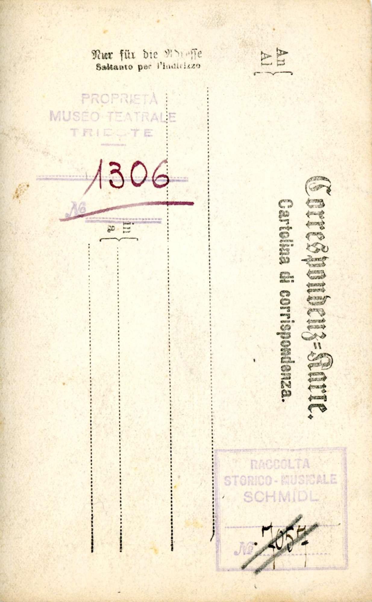 In costume di scena, probabilmente nel ruolo di Mignon nell'opera omonima. A Trieste ha cantato al teatro Verdi nel 1899 in"Andrea Chenier", "Boheme", "Saffo"e "La resurrezione di Lazzaro"; nel 1914 in"Don Pasquale"e "Traviata"; nel 1920 in "Lodoletta"; al Politeama Rossetti nel 1900 in "Mignon"; al teatro Fenice nel 1894 in "I pagliacci" e nel 1896 in "Mignon" e "La pupilla"