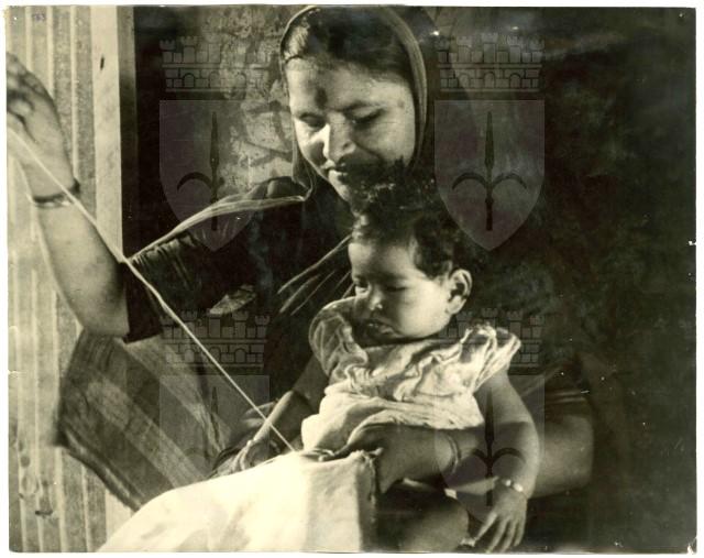 Ritratto di lavoratrice tessile hindu fotografata nell'atto di tessere una tenda mentre tiene il figlio in braccio