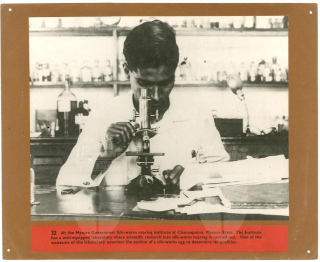 HomeAt the Mysore Government Silk worm rearing institute at Channapatna, Mysore State. The Institute has a well equipped laboratory where scientific research into silk worm rearing is carried out. One of the assistants of the laboratory examines the section of a silk worm egg to determine its qualities
