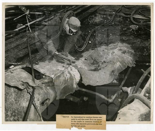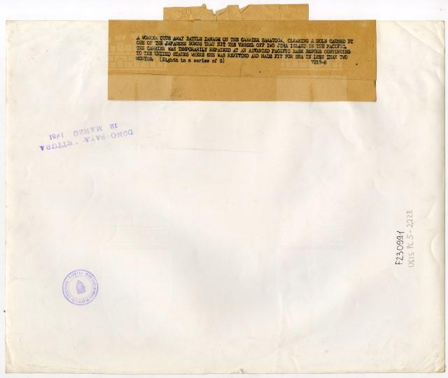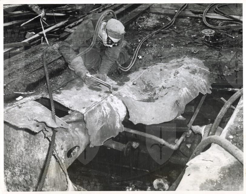 A worker cuts away battle damage on the carrier Saratoga