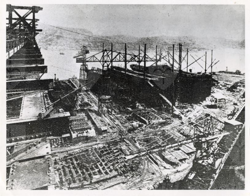 Veduta dall'alto di un cantiere navale giapponese nell'area di Nagasaki, obiettivo militare americano.