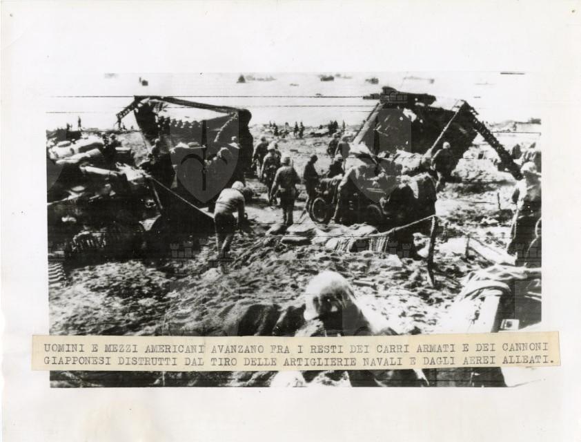HomeUomini e mezzi americani avanzano fra i resti dei carri armati e dei cannoni giapponesi distrutti dal tiro delle artiglierie navali e dagli aerei alleati