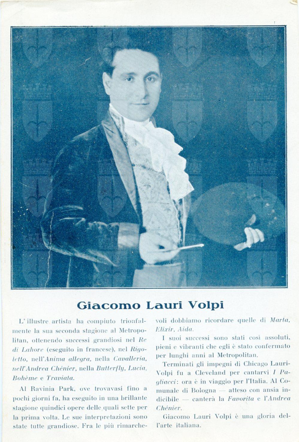 In costume nel ruolo di Cavaradossi in "Tosca". A Trieste ha cantato in "Rigoletto" al Politeama Rossetti nel 1920 e al Teatro Verdi nel 1942 ; "Andea Chenier" nel 1925 al Politeama Rossetti