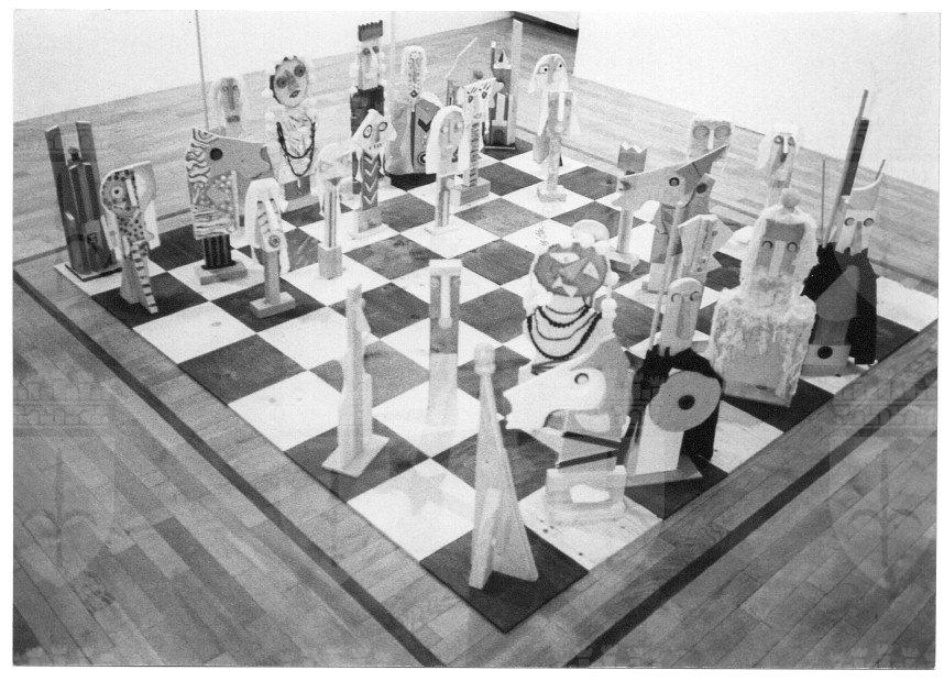 Gli Scacchi di Baj, realizzati nel 1988, sono un multiplo, ufficialmente con una tiratura di 30 esemplari (in realtà ne sono stati realizzati 15) + cinque contraddistinti da numeri romani da I a V. Dimensioni: altezza media dei pezzi cm 75; Scacchiera cm 272 x 272 composta da 64 caselle di cm 34 x 34; Pedana scacchiera cm 282 x 282 altezza cm 34.