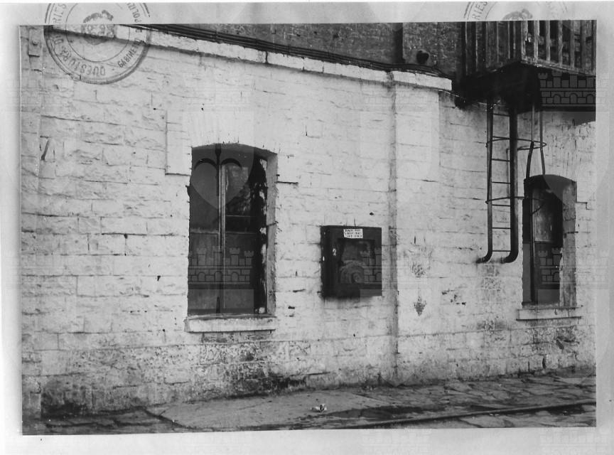 Riproduzione di una fotografia della facciata di un edificio all'interno della Risiera di San Sabba, sul recto il timbro della Polizia, probabile materiale del Gabinetto di Polizia Scientifica della Questura di Trieste