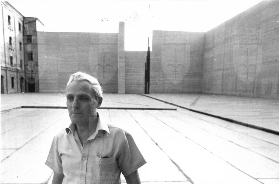 Mario Montanaro in cortile. "Pietà" sullo sfondo