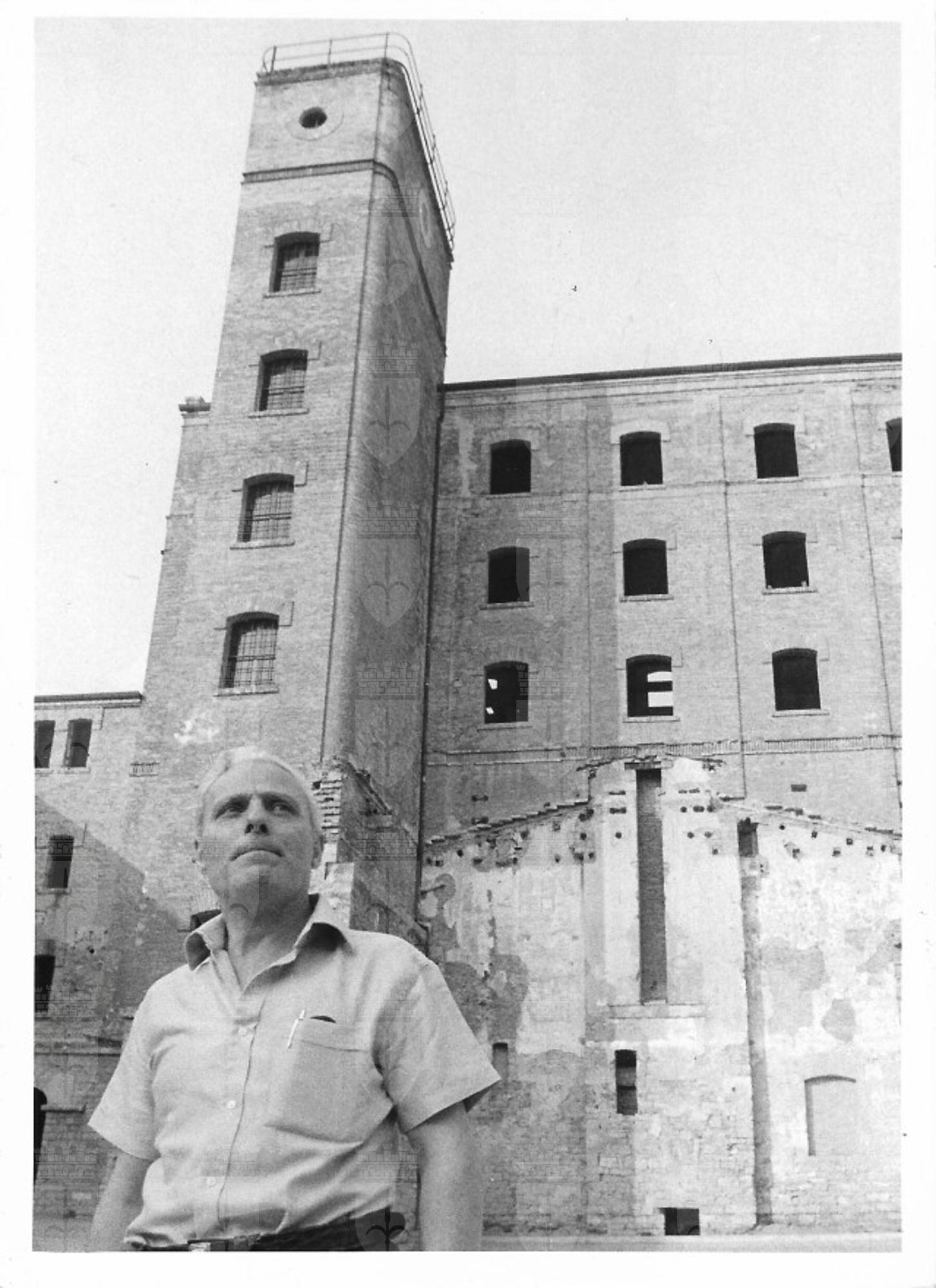 Mario Montanaro in cortile. Edificio centrale sullo sfondo