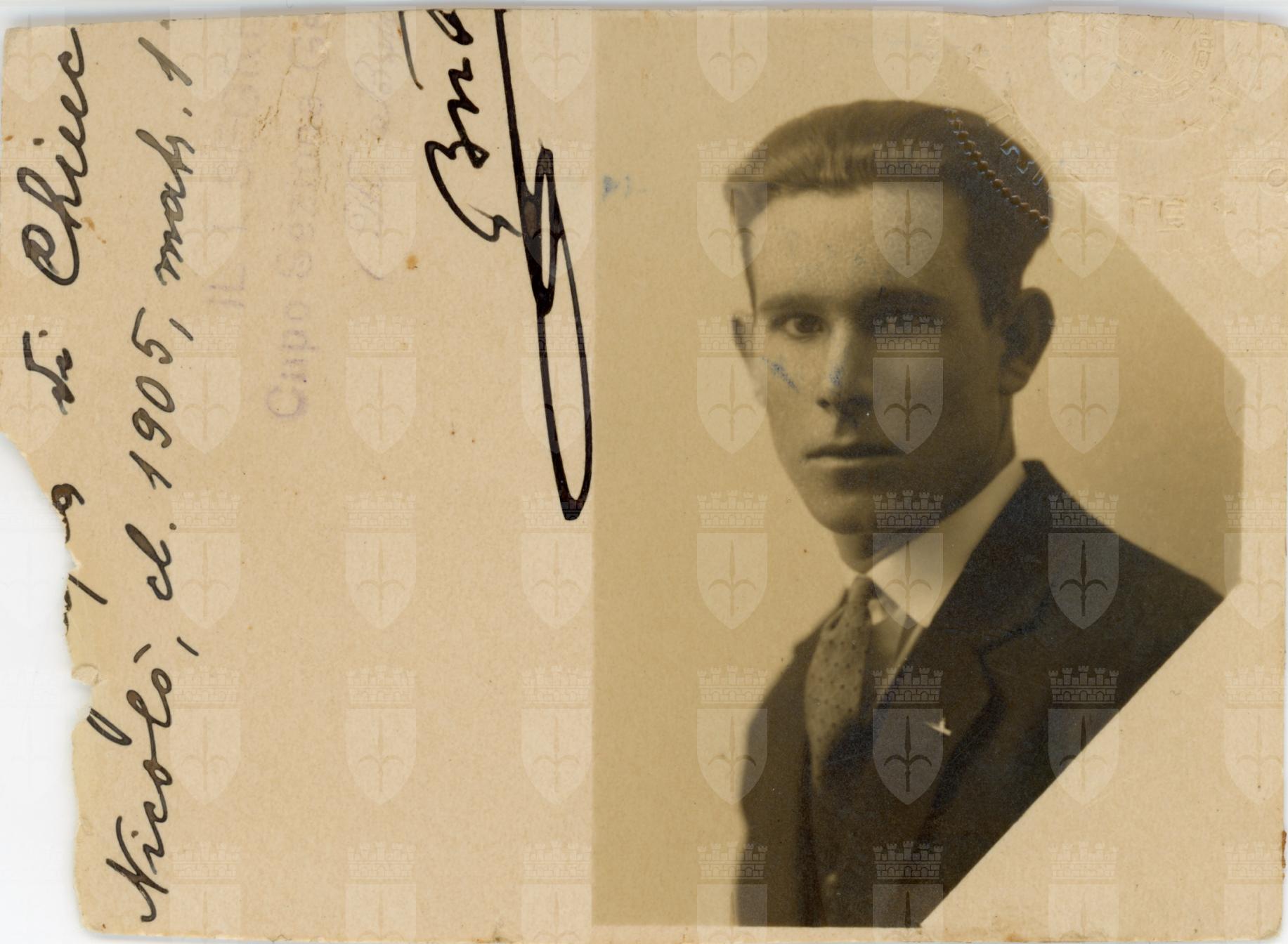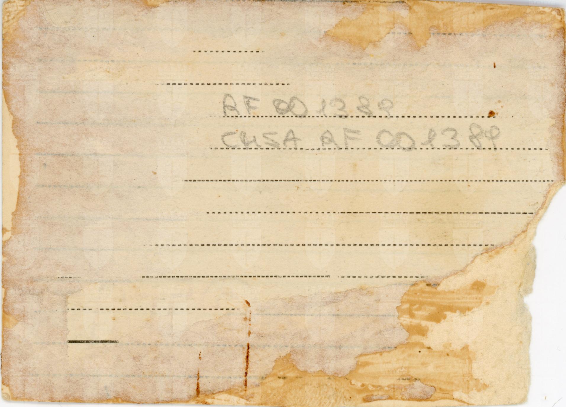 Foto su tessera di Nicolò Chiucchi, deportato a Dachau, di cui ci sono alcuni diari della sua prigionia. Il timbro a secco nella parte superiore ha lo stemma della Regia Aeronautica. In uso a partire dalla primavera del 1930 fino al luglio 1943