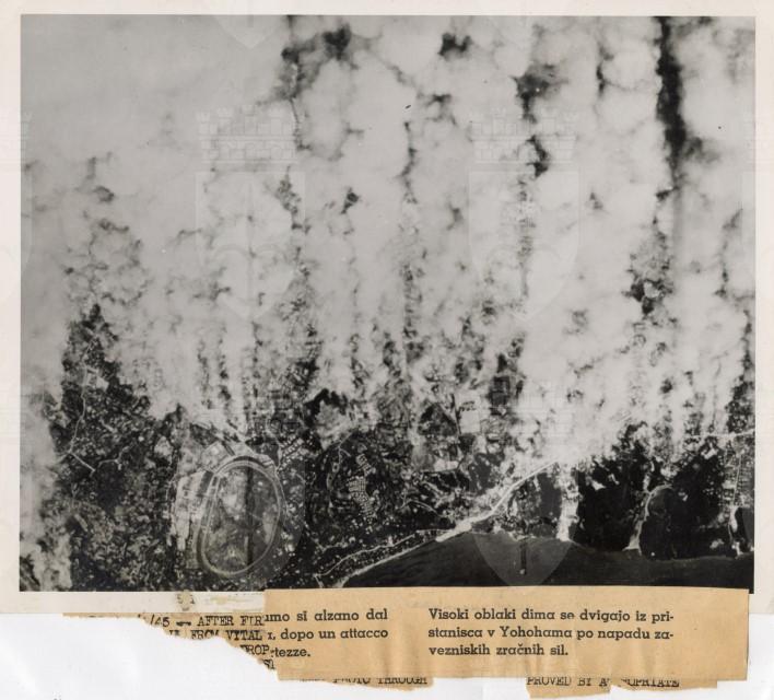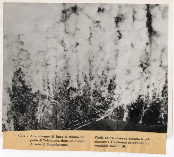 Veduta aerea di un attacco delle superfortezze americane sulla città di Yokohama.