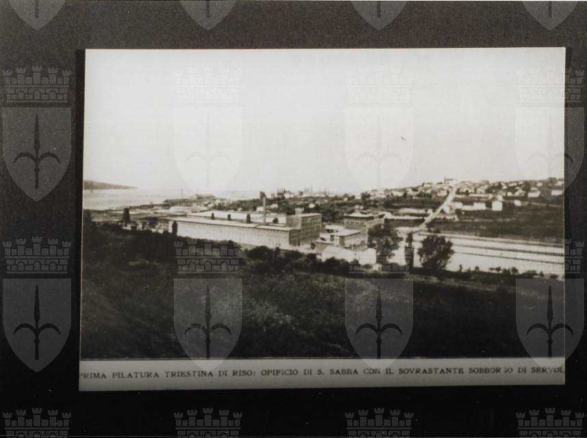 Riproduzione fotografica degli edifici della pilatura del riso, dei magazzini