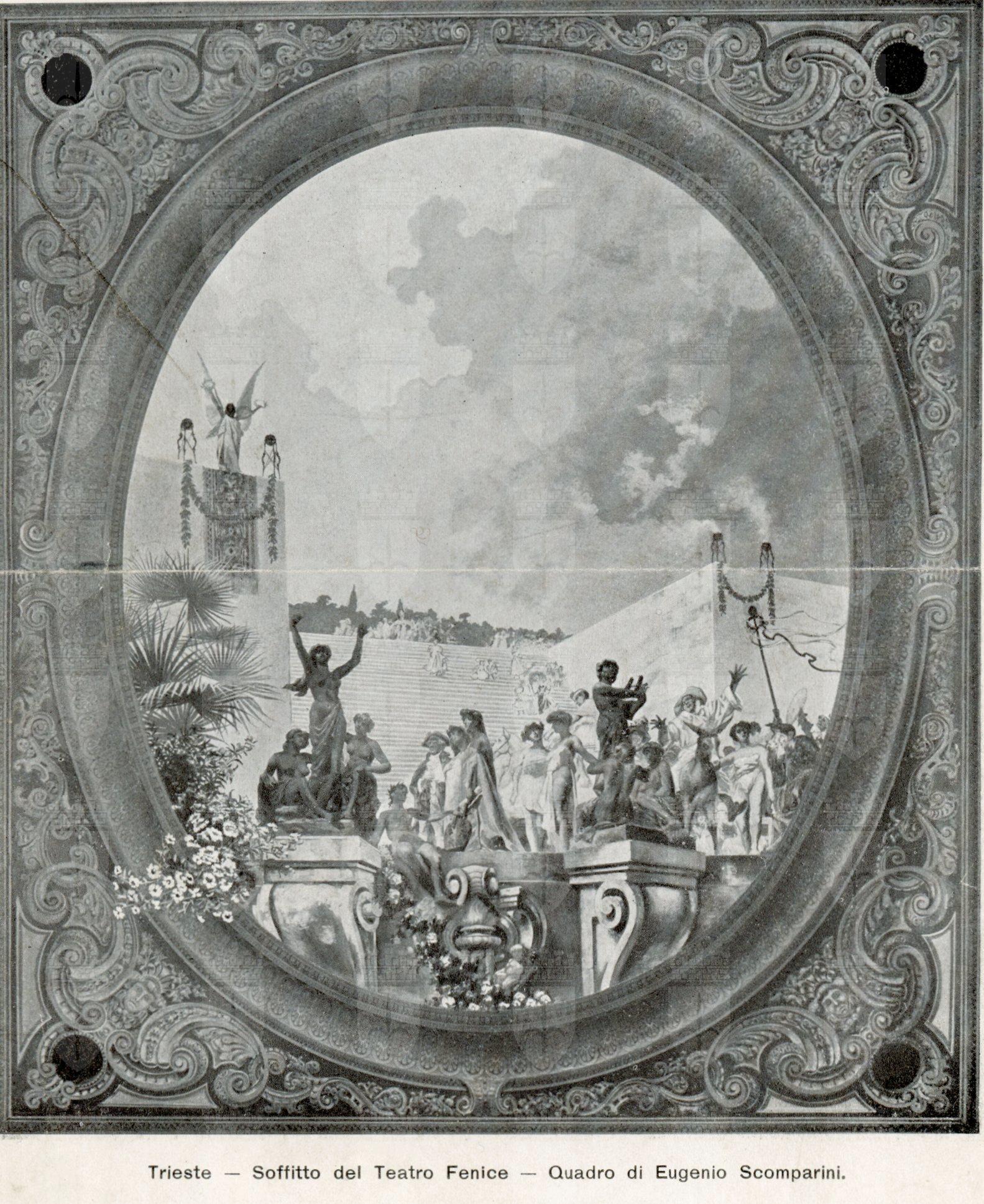 Soffitto della sala del Teatro Fenice di Trieste, già Anfiteatro Mauroner, dopo la ristrutturazione del 1905. La composizione è opera di Eugenio Scomparini e raffigura l'arte teatrale in tutte le sue varianti.