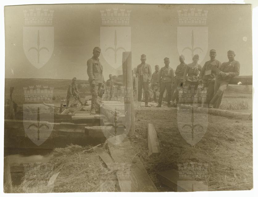 Lo squadrone tecnico del 12. Reggimento Ulani costruisce un ponticello a Tsevelychi (Czweliczy), villaggio nel distretto di Lokachi. Sulla destra: il tenente Juhasz, il capitano Chiachich e il sottotenente Kubinyi