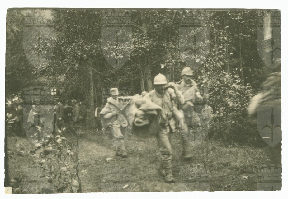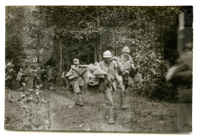 I feriti del reggimento vengono trasportati al primo soccorso : Battaglia di Oituz : 9 agosto 1917