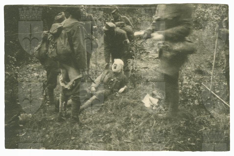 Un ferito dopo le prime cure viene trasportato sul carro ambulanza. Tra l'8 e il 20 agosto 1917 il Reggimento Ulani n. 12 prende parte alla seconda Battaglia di Oituz