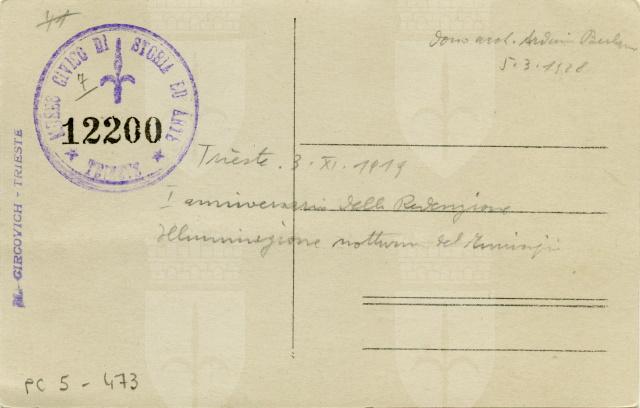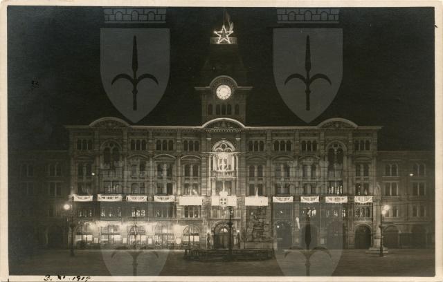 Illuminazione notturna del palazzo del Municipio in occasione del I anniversario della redenzione di Trieste.