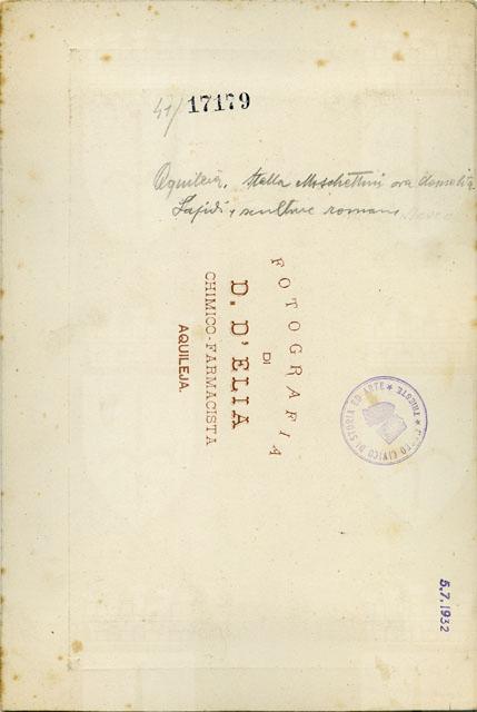 Particolare della facciata della cosiddetta "stalla" Moschettini costruita ad Aquileia nel 1824 da Gerolamo de Moschettini, funzionario del governo austriaco preposto alla tutela del materiale archeologico rinvenuto in città. Il fabbricato si caratterizzava per almeno due facciate costipate di rinvenimenti archeologici quali iscrizioni, statue, colonne, ma non solo, murati in modo affastellato e con accostamenti improbabili. Oggetto di un lungo contenzioso con le Autorità, che contestavano al proprietario di essersi appropriato illecitamente di beni pubblici, la stalla venne demolita nel 1887 e i reperti in essa murati confluirono al museo locale. Per un più ampio inquadramento dell'opera e delle vicende che la videro protagonista si rimanda alla scheda della fotografia F17174.