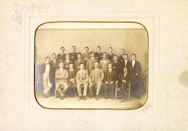 Il fotografo ritrae i personaggi presso il gabinetto dello studio, addossati su un fondale.