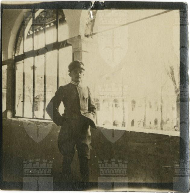 Spiro Xydias convalescente nell'ospedale di Tappa a Udine, dopo aver riportato delle ferite al volto. Spiro Tibaldo Xydias, nato a Trieste nel 1887, laureato in giurisprudenza, fu uno degli animatori del movimento irredentista a Trieste e dell'azione nazionalista. Allo scoppio del conflitto passò il confine con Ruggero Timeus e si trasferì a Roma ove, il 24 maggio 1915, si arruolò nell'81° Reggimento fanteria. Si distinse in vari combattimenti e cadde il 14 agosto 1916 sul Nad Logem, al comando di una sezione mitragliatrici.